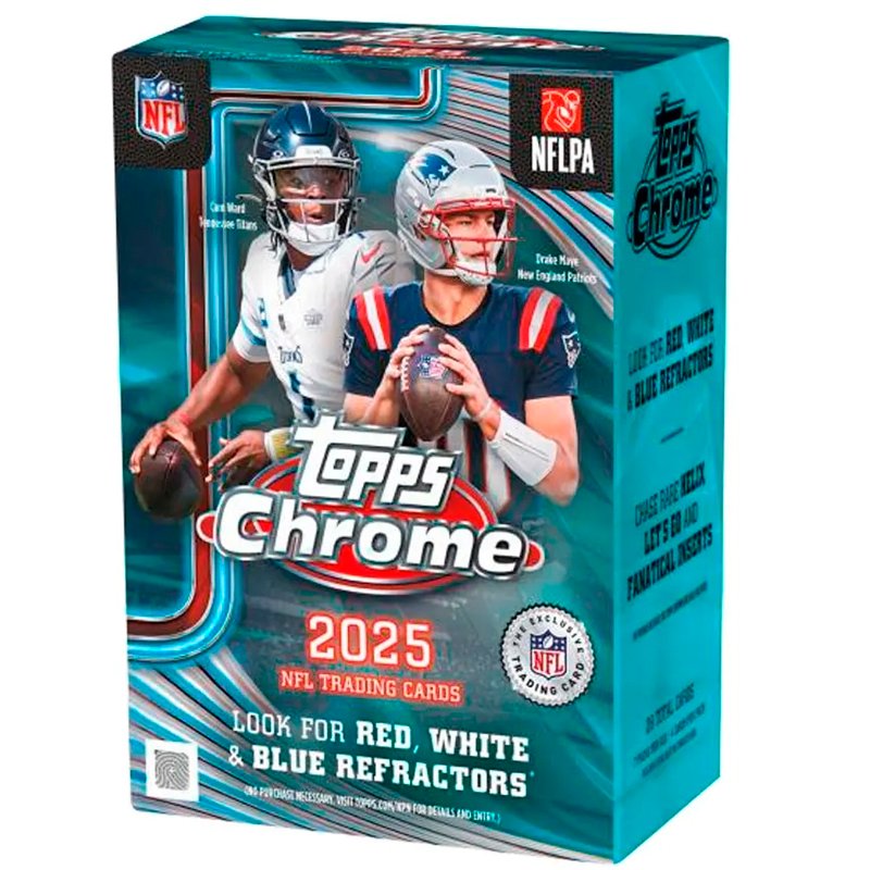 The 2025 Topps Chrome NFL – Value Box It brings all the brilliance and quality characteristic of the Chrome line to American football. With star players, standout rookies, and multiple inserts, it's a very complete option for collectors. 🏟️🔥