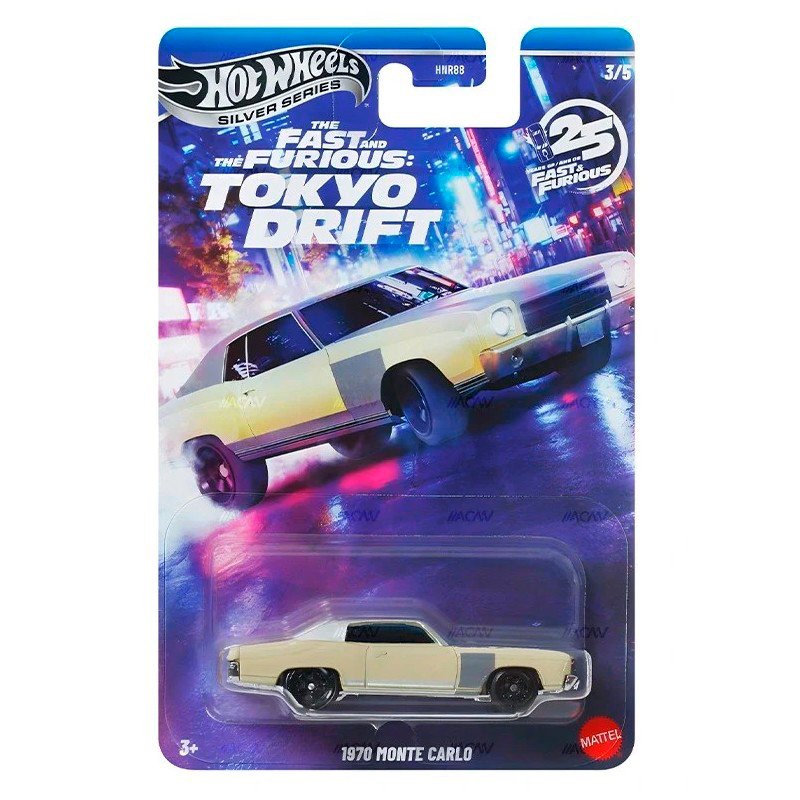 This 1:64 scale Hot Wheels model reproduces the 1970 Chevrolet Monte Carlo that appears in the opening scene of Fast & Furious: Tokyo Drift, Driven by Sean Boswell in his first street race. An iconic car from the movies, with classic muscle car styling and details that respect the original design from the film.