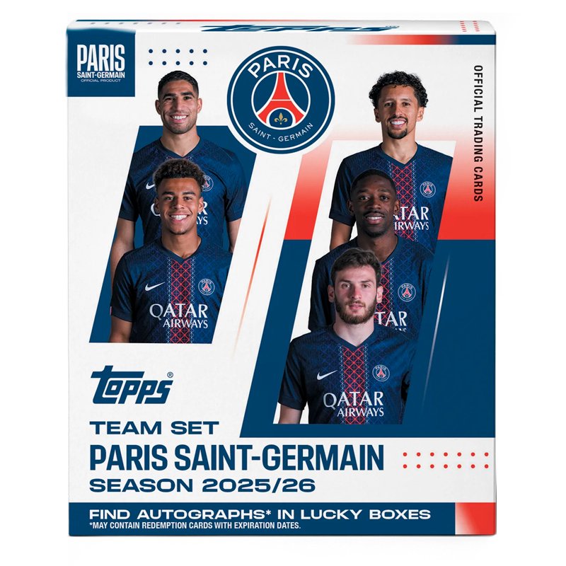 He 2025-26 Topps Paris Saint-Germain – Team Set Bring together all the stars of the Parisian club in an official collection designed for fans and collectors. It includes key PSG players, new signings, and standout rookies, all with Topps' signature clean and modern finish. ✨📦